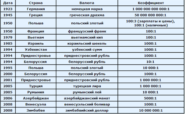 - Определяется коэффициент пропорции обмена денег, кратный 10, например, 1:10, 1:1000 и пр. Самый большой коэффициент история показывает в Германии 1 к триллиону.